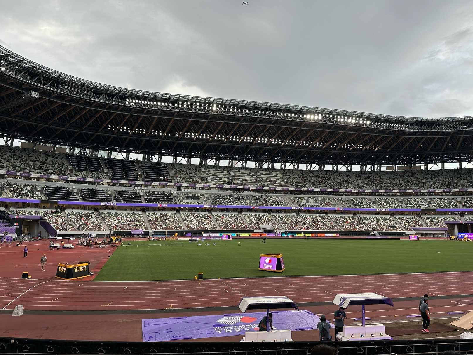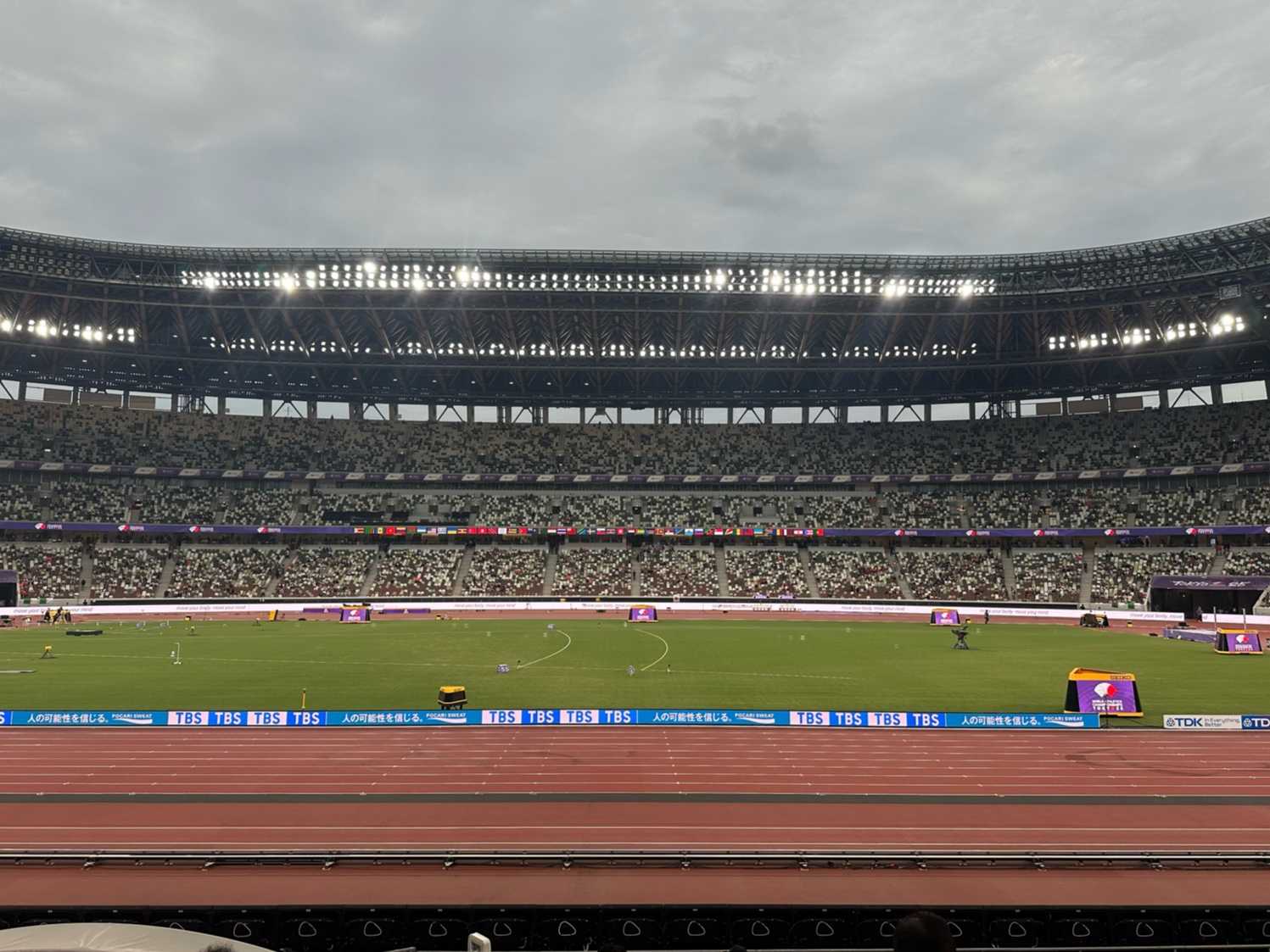 続々。あにゃこらが!!世界陸上にきたー!!!!織田裕二のスペシャルアンバサダーが決まった時にバック側のチケットを即購入。メインは土日五万円で手が出ない。。。でも、これ、メイン側からも見ないとあかんのでは!?と旦那さんをつついて、むりくり取ってもらったメインのチケット。メインのほぼ中央ブロック、前から15列目のこれまたなんと素晴らしいお席で。お一人3万円(平日価格)のお席(・∀・)どどどどどん絶対にこんな間近で見ることはない!と思い切ったけど、本当に素晴らしいお席でした。ホントに旦那さんありがとうー!!しばらくもやし生活頑張るぅー!!午前中お仕事してダッシュで国立競技場へ。アクセスが良かったのと、入場がスムーズで16時50分過ぎには競技場の中へ。メイン側は、お席に入る時に必ずチケットチェック がありました。空いていたので、1番前まで行ってお写真を。メイン側は、割と外国の方が多くて 南米系のおじ様に写真撮ったろか?と愛想よくて撮っていただけました!昨日の暑さから10度も気温が下がった東京は、着いた途端涼しい!と思えるくらい快適で。7日目もやり投げ予選に三段跳び決勝、男子5000メートル予選男子女子400メートルハードル決勝男子女子200メートル決勝女子7種競技が100メートルハードル、高跳び、砲丸投げなど競技中にいっぱいしてました。そして国立場外ではメダル授与式も。国立場内の売店がお高いので、羽田空港で購入。たぶんこんなことがないと勢いで食べないであろう千疋屋の二千円のフルーツサンド。会場を盛り上げてちょいちょい現れるりくワン。北口選手、残念だったけども、元気なかったけども、ちゃんと観客席に手を振って帰って行きました。本日も満員で大歓声な国立競技場。男子女子200メートル決勝は、凄まじい声援。会場の一体感がすごかった。そしてめちゃくちゃ速い!!一瞬!!目の前で超人達のすごい姿が見れて感動しかない!!