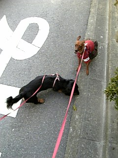 けっこうご無沙汰だなーヾ(;´▽`A``アセアセHP来るのもオヒサヾ(・∀・。)ノダ-!!!ゴメーンwつい先日、晴れた日に友達の犬と一緒に散歩へ行きました(*`д´)b ジャン!!( ̄ε ̄〃)bあんずが誰かの犬と一緒に散歩するなんて初めてやったんです。たまたま友達が飛花の家の近くまで散歩に来てると電話かかってきたんで、一緒に散歩しようってことになったのだ。一緒に散歩するのはイィんですが、↑のあんずのビビりよう(ノ∀`*)笑最初吼えまくってたから大変やったーヾ(;´▽`A``アセアセ なかよく散歩したら良いものを、一定の距離を保って歩くあんず姫(*´σ з`)wちなみに、一緒に行った犬はミニチュアダックスフンドの♀で一歳、あんずより年下やのにあんずはキャンキャン吼えてやがるし 笑ハピィって名前で生後一ヶ月くらいのときに一回触りに行った時から頭がデカくて、案の定図体もデカくなってました(*´σ з`)笑まぁ楽しかったっちゃー+。:.゜ヽ(*´∀`)/゜.:。+゜あんずのお友達第一号かな!?笑