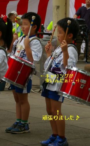 今日は幼稚園がある町内のお祭りに、年長さんだけマーチングと盆踊りに参加してきました夏休み前に急きょ決まった参加のため自由参加でしたが、行ってみると沢山の園児がいて賑やかでした 初めてのマーチングを披露(^^♪皆笑顔より、真剣な顔でした♪お次はうちわを持って…今度は皆笑顔で楽しそう(^^♪そして、出番のない年少の娘はというと…お兄ちゃんの出番が終わるのを待って、お待ちかねのヨーヨー釣りにかき氷、輪投げと堪能していました 食べ物以外の子供達のゲーム類は全て無料という優しさ心配された雨も降らず、天気に恵まれて終わる事ができましたにほんブログ村