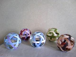 ブログ1周年プレで贈った、エコの毬の作り方を教えて~♪というメッセージを頂いたので、紹介しますね。ちなみに、 ここで紹介する作り方は、私が利用している「紙バンドの色見本のパンフレットに載っていた作品」を見て、とっても綺麗なので、どうやって作るんだろ~???と試行錯誤で作ったやり方です。それから、色見本のパンフレットに載っていた作品の作り方をブログに載せて良いのか?とも思ったんですが、つい先日、書店で立ち読みしていると、エコクラフトの新刊 「和風エコクラフト手芸」 にこの毬の作り方が載っていました。本でも紹介されています。 1.紐は4本取り・15cm (贈った物は、8本取り・30cm) 6本。 1番ラベンダー・2番パステルブルー・3番アイスブルー 4番ラベンダー・5番パステルブルー・6番アイスブルーの順で使います。 紐は予め、丸みを付けておくと丸い形になり易い。これ、ポイント! 2. 1番と2番を組み合わせる。3. 3番をそれぞれ上下、上下、になるようにかみ合わせる。4. 4番(木製ピンチの付いた方)を図の位置に組み合わせる。 5.5番を図の位置に組み、重なる紐は交互に上下、上下、となるよう組み合わせる。 形を整え、星型にする。 6. 6番を図のように組み合わせ、星型の5つの点(ピンチで止めてあるところ)を通って、1週する。 この時、開始位置に6番をあててピンチで止め、丸みを作るように、 手の中に包むように持って作業すると良い。 重なり合う紐は、全て上下、上下となるよう組み替えながら行う。7.1週したら、重なる紐を図のようにピンチで止めておく。 8.6番をボンドで貼る。この時、図のようにカットすると、収まりが良い。 9.同様に、他の紐も貼り合わせていく。 図は、ラベンダーを張り合わせているところ。完成。出来上がり寸法は、直径6cm。 中に小さい毬を入れる時は、5角形の部分を押し広げ、入れる。拙い説明で分かり難いかもしれませんが、参考になると嬉しいです。 話は変わって、先日発送した、私のブログ1周年プレを素敵に紹介して下さってます。↓ ぽこっこさんへの と mao164498さんへの です。こちらもご覧下さいね。