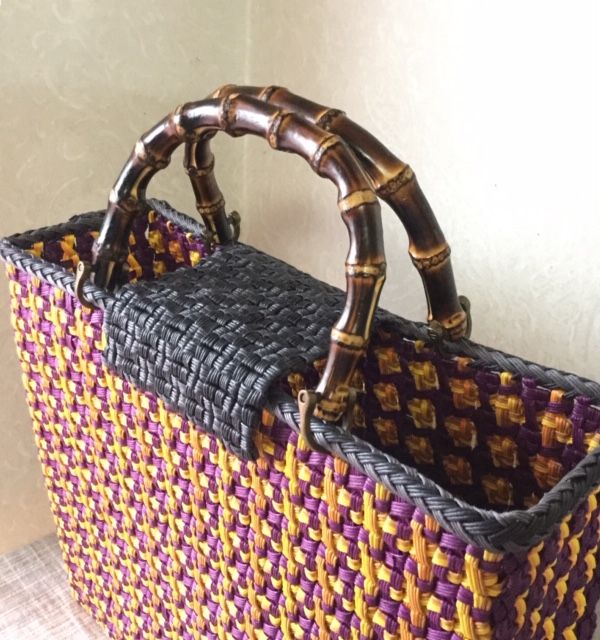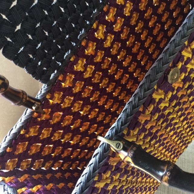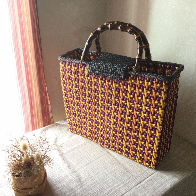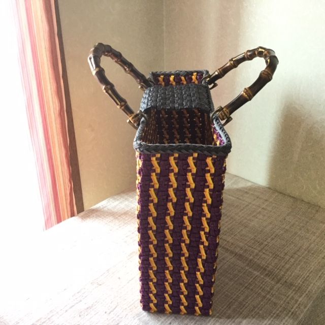 リバーシブル編みの格子模様(底面)千鳥格子模様(前後面)ストライプ模様(サイド面)の3パターンを1つのBAGに取り込んだものでした。