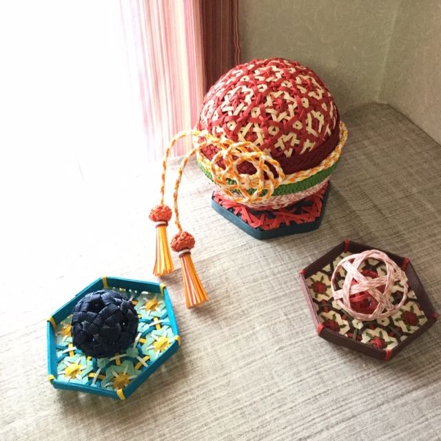 pic4の小さい球は、石畳編みと、紐を組んで作ったものですが、どちらも正5角形を12個作るやりかたです。形は正12面体といいます。