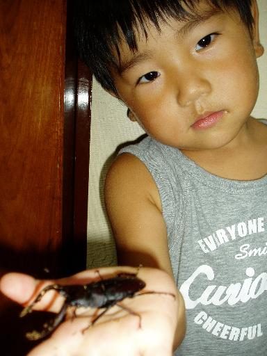 チビもベビもクワガタが大好き。毎日、夕方になるとみんなわらわらと出てくる。「ごはんをあげるよー」と言うと、ベビも走ってくる。各々。昆虫ゼリーを片手に順番を待つ。そして、ふたを開けてあげると、ポトンと木の上にゼリーを落とし入れる。チビは、カブトムシも好きで、ふたを開けると毎日取り出しては眺めている。この前も、手にとって眺めていたら、玄関から「ただいま~」と聞こえたものだから、カブトムシをどこに置いていくか迷って置いたのが、ベビのお腹の上。ベビはびっくりして「ひ~。ひ~。」と言っていた。ベビはまだ、ちょんちょんとつつくぐらいしかしないから、自分の体にくっつけられたら怖かったんだね。チビはもう、クワガタも自らすすんで持てるようになったよ。去年はセミもこわごわだったのに…。セミは泣き声でビビるみたいね。何回か挟まれているけど、それで嫌になることはないみたい。昨日もがっつり挟まれて、かなりわたわたしていたけど、そのあとも触っていたし…。今年は頼もしいものだよ。ちょっと緊張するのか、写真を撮るといつもこんな顔になる。でも、このノコギリクワガタ、とっても大きいと思うんだよね。測ったら、6.5cmあったよ。チビの手と比べても大きさが分かるでしょ?最近、ママは仮面ライダーキバが好き。だから、一番大きいこの子は「キバ」と命名。次に大きい子はチビの好きなゴーオンジャーから名を取り、「レッド」。ネットで調べたら、そろそろ、みんな産卵期のようでメスを違うカゴに移した。産卵材を入れて、湿気を多くしたら、メスたちはみんな潜ったまま出てこなくなった。たまに、えさを食べにくる子もいるけど・・・・ほとんど餌も減っていない・・・。卵を産もうとしてるのかな?それとも土の中で…弱ってる?何とか卵から成虫になるまでを見せてあげたい。いや、ママが見たい!ガンバレ!