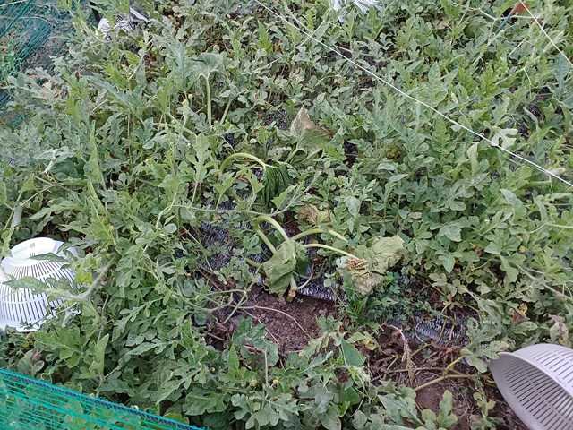 カボチャは株元付近から葉が枯れ、伸ばしている子蔓も暑さで細く枯れていっています。右側から左奥に伸びた蔓はどんどん伸び、左手前に戻ってきています。株元付近が枯れているのに先はどんどん伸びています。蔓を動かした際にサツマイモのように蔓から根が出ていました。蔓は動かさない方が良いようです。秋採りのカボチャを2株定植しましたが、ウリハムシがたかっていました。先日防除したんですが、また寄ってきたようです。1株は寒冷紗を掛けましたが、もう少し大きくなるまで行燈をした方が良いかもしれません。なかなか実のコルク化が進んでいないですが、虫は実を食べていました。爪がまだ刺さるのですが、早く収穫しておいた方がいいのかな。スイカがまた割れていました。昨日は大丈夫でしたので、食べられそうかなと持ち帰りましたが、まだ甘くなかったようです。また実が増えていたので実の着けすぎかもしれません。最近ついたような実をとりました。これでもまだ11個着果しています。ランキングに参加しています。クリックよろしくお願いします。にほんブログ村