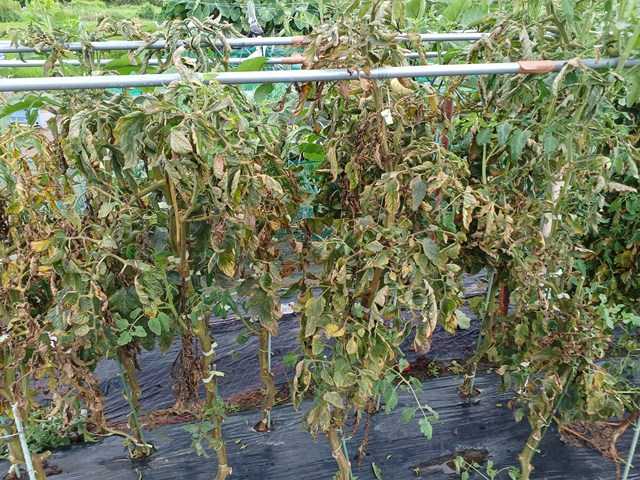 今年はトマトの実が上に着きませんでした。早く大きくなったものは幾らか着いていましたが、後からはほぼ着きませんでした。久しぶりに見てみると、茎が茶色くなっています。トマトサビダニでした。もう実もほとんど着いていないので撤去することにしました。支柱はナスのカラス除けの網が掛かっているので、もう少し置いておきます。右端のはミニトマトです。これもダニにやられて実も殆どなっていませんが、網に絡まっているのでしばらく放置です。ランキングに参加しています。クリックよろしくお願いします。にほんブログ村