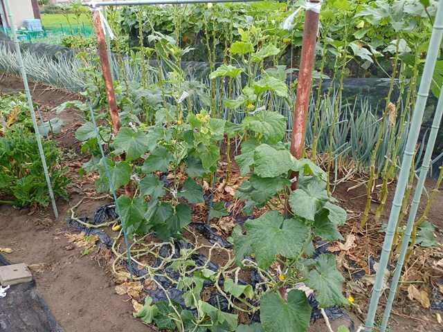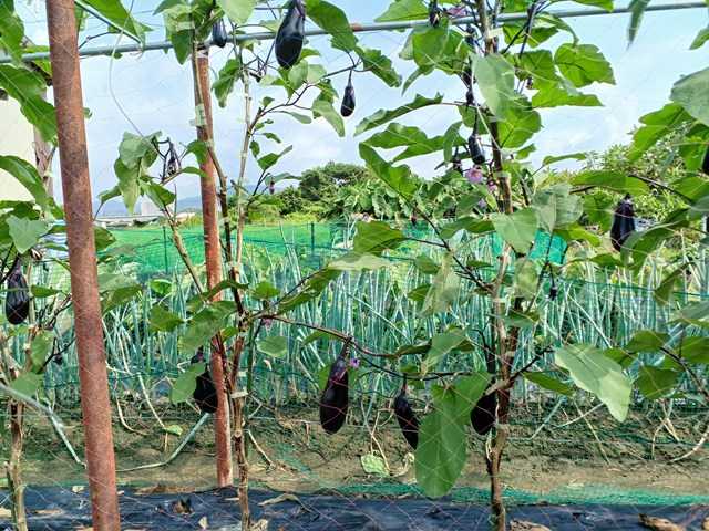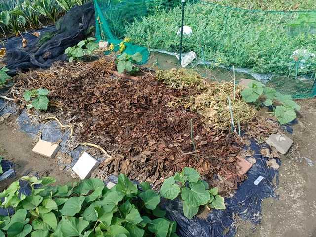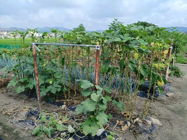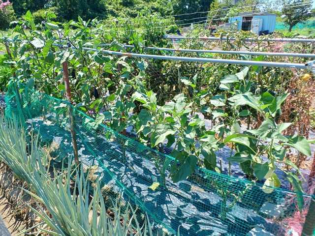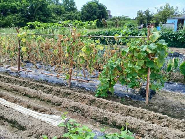 今年は空梅雨で、その後急激な気温の上昇で作物に影響が出ています。うちもナスに日よけをしていましたが、日よけのない第二弾はいつもよりよくできているので、寒冷紗を外しました。熊本長ナスは光が足りないと艶が落ちるのもあり外しました。サツマイモにも寒冷紗を掛けていましたが、大分蔓が伸びてきました。これから寒冷紗も必要になるので、外しました。家でキュウリとカボチャを播種していましたが、光が足りず徒長気味です。なので、定植することにしました。これはカボチャです。キュウリはこの倍くらい徒長していました。キュウリはカボチャの所に、カボチャはスイカの所に植えました。今年はまたウリハムシが多くなってきたので防除しました。キュウリは台風対策で這わせていきます。ランキングに参加しています。クリックよろしくお願いします。にほんブログ村