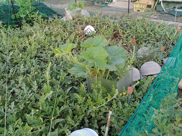 秋採りのカボチャ2株の親蔓が伸び、子蔓も出始めてきました。スイカの跡に植える予定でしたが、まだスイカが元気で、スイカに埋もれそうです。こちらは寒冷紗を掛けていたので、押さえつけられて曲がっています。子蔓を伸ばしていきますので、親蔓の摘芯をしました。まだまだウリハムシがいるので、どんどん大きくなってもらう必要があります。スイカがどんどん割れています。受粉から1月経たず割れています。割れたものには小さな亀裂が入っているので、もしかしてこれが割れるサインかもしれません。割れると嫌なので、先日同時期の受粉と思われるものを3個収穫しました。熟れているかどうかはわかりませんけど。割れたものは持ち帰り切ってみました。奥様曰く、甘いわ、合格を頂きました。ちなみに、糖度は10%ちょっとでした。実の着けすぎではないかと思い、新たに着いた実は摘果しています。少し前には4つ取り除いていました。収穫間近のスイカが3個になったので、そろそろ終わりかと思っていましたが、またどんどん実が着いています。幾らか残して、摘果しました。カボチャはなかなか硬くならずに、ダンゴムシの餌食になっていました。もう終わりのキュウリは虫食いが多くなりました。大きい黄色いキュウリは採種用に大きくしたもので、家に持ち帰り種を採ります。ランキングに参加しています。クリックよろしくお願いします。にほんブログ村