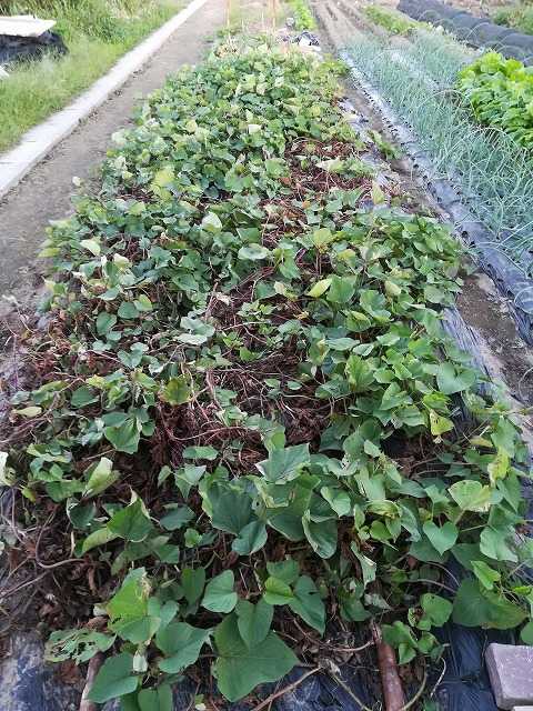 先日真ん中の筋を収獲して横の畝の蔓を切ってしまったサツマイモ。