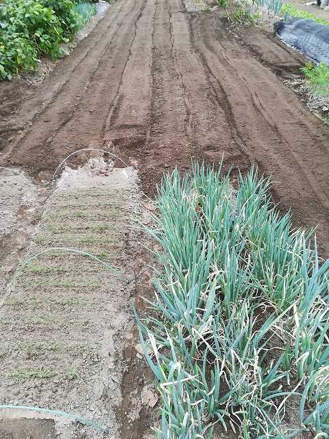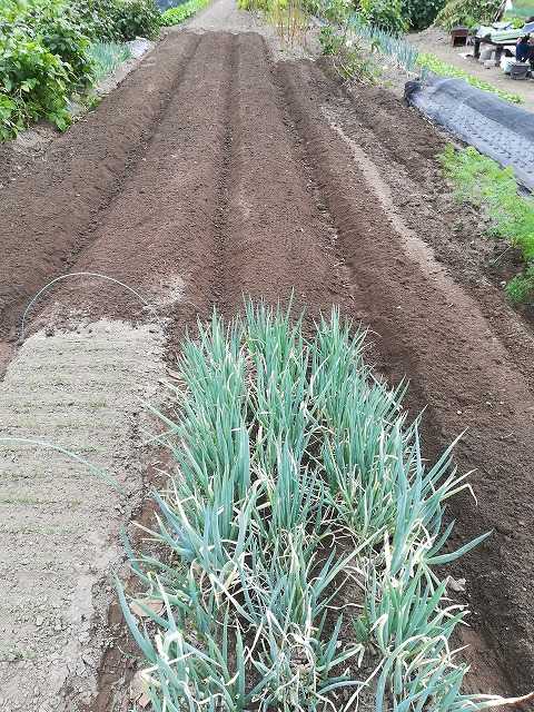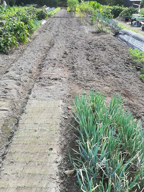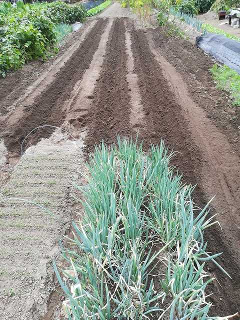 鶏糞、石灰を撒き鋤いて、畝を作りました。
