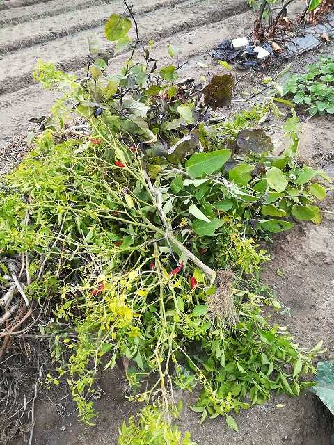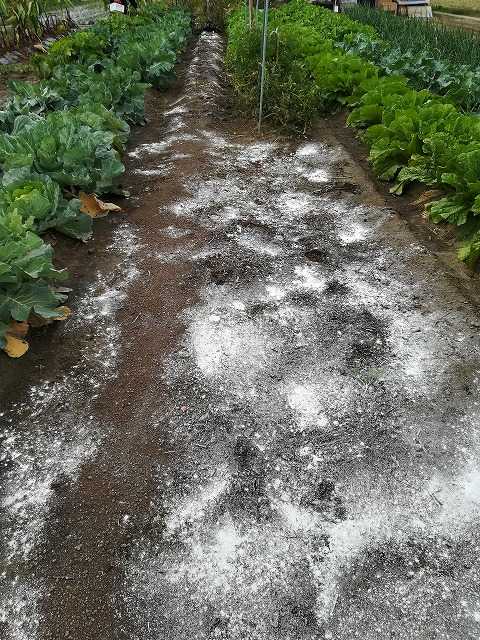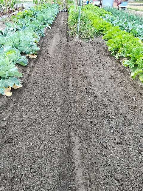 撤去したところに石灰と鶏糞を撒き、鋤き畝を作りました。
