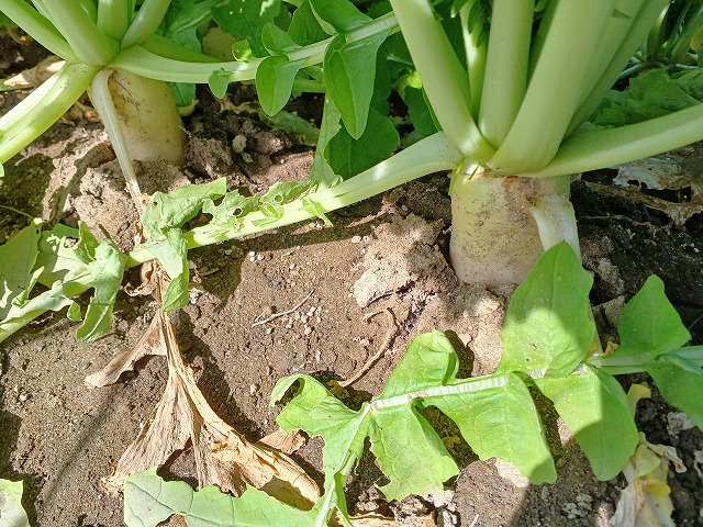 大根第二弾までは虫の食害がひどくて表面が茶色くなり、お裾分けするにはひどすぎました。