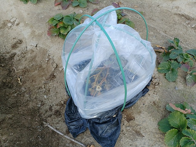 どうなるかわかりませんが、マルチを敷いてビニールを掛けました。