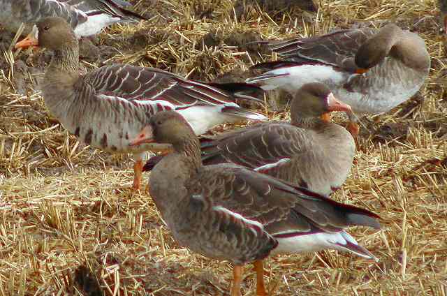 蕪栗沼の近くでえさをついばんでいるマガンです。太陽が沈んで夕闇がせまるのを待っています。