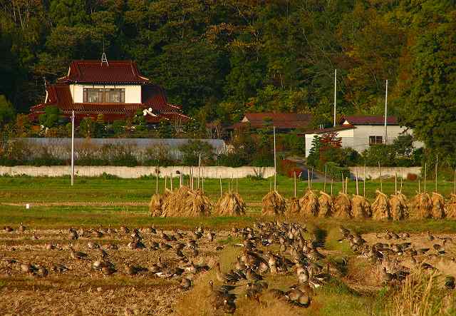 ラムサール登録湿地に指定された化女沼の近くの刈り取りの終わった田んぼの中でマガンが落穂をついばんでいました。望遠300ミリではなかなかひきつけられません。