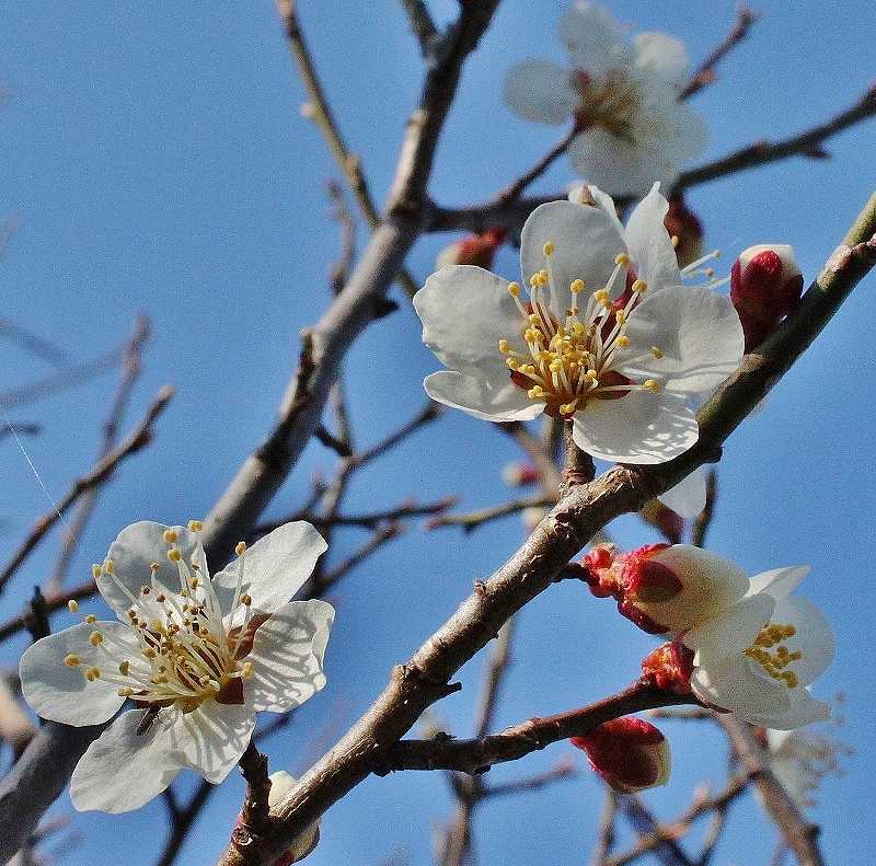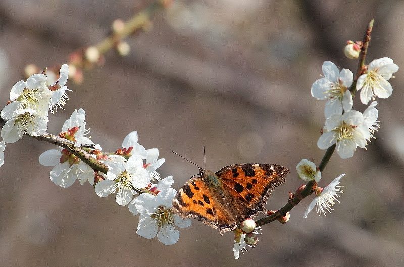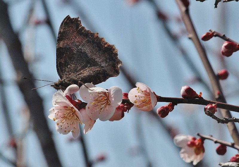 化女沼の梅もやっと咲き始めました。梅の花にやってくるチヨウもいるんですね。鳥ではなく蝶です。花と蝶のコラボは初めてです。