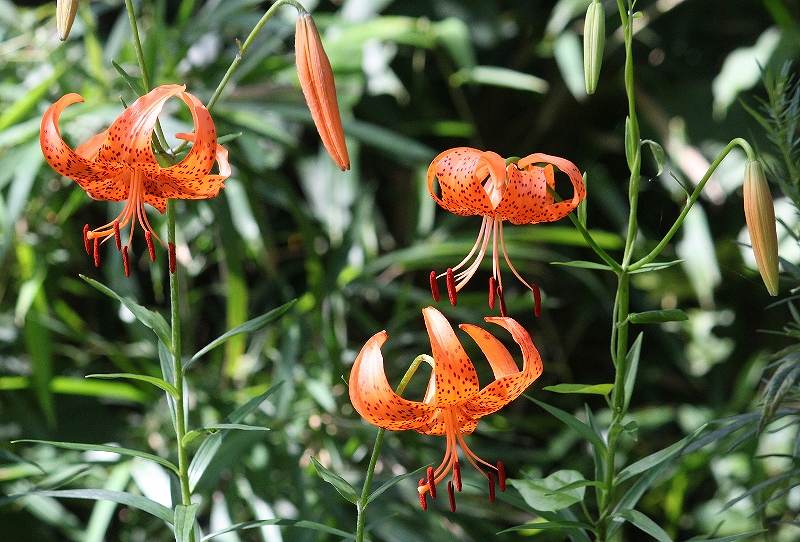 我が家の庭にオニユリの花が咲き始めました。しばらくぶりの化女沼の林の中には同じ色のユリの花が咲いていました。コオニユリ(小鬼百合) ユリ科 花が小型、繊細で、“ムカゴ”をつけない 観賞ではなく、数千年来、食用として栽培されてきた。 凶作時の非常食として日本全国に分布した。 食用にする百合の根(鱗茎)はほとんどコオニユリの栽培品種だそうです。 (オニユリ、ヤマユリも食用になる)庭のオニユリ