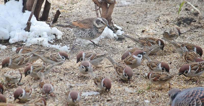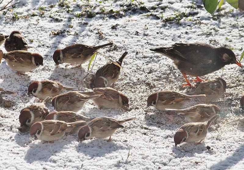今日も午前は晴れていたのですが、午後からは雪が降り出しました。今日も庭には子飼いの鳥たちが勢ぞろいしました。ツグミ、ヒヨドリ、ムクドリ、キジバト、スズメ
