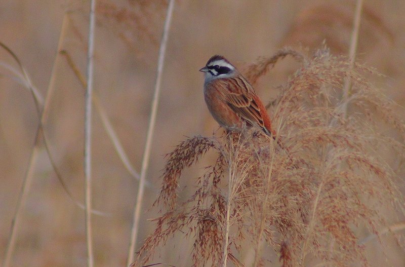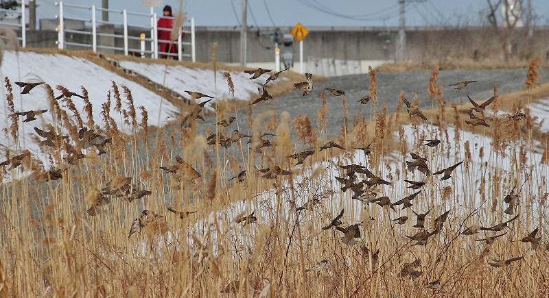 江合川沿いの葦に群がっていたスズメたちです。ベニマシコオオジュリン?