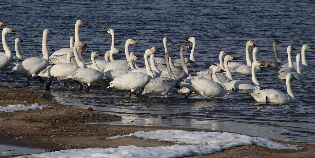 今日は近くの江合川に行きました。まだ川辺は残雪が残って歩きにくいです。今日は風の強い日でしたが、白鳥(ほとんどオオハクチョウ)とカモ(ほとんどオナガカモ)が集結し整然と行進?していました。 江合川にて