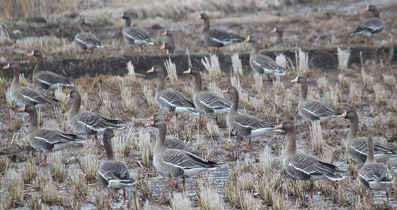 化女沼近くの田んぼでガンが餌を食べているのを見かけました。まだガンは残っているんですね。このように皆なが立ち上がって一方向を見ているのは警戒姿勢のようです。
