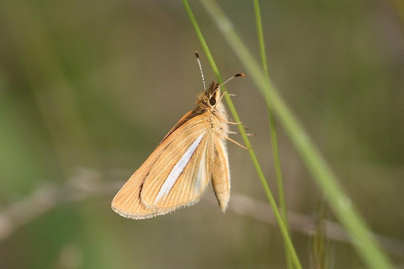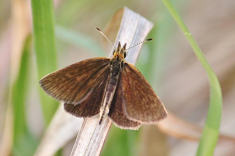 化女沼の、この場所だけで毎年この蝶を見ることが出来ます。1週間前は1匹でしたが、今日は多数の蝶が飛んでいました。羽を開いて止まってくれたので、翅の表を撮ることが出来ました。小さな蝶ですが、近づいても逃げません。ギンイチモンジセセリ(銀一文字挵) 環境省 準絶滅危惧種