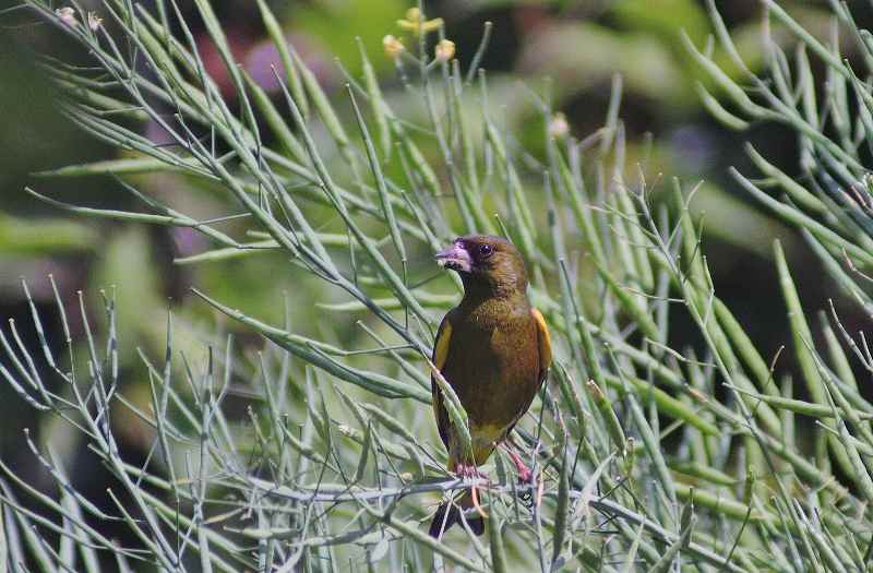 我が家の庭の菜の花が実をつけ始めました。待ちかねたカワラヒワがやってきました。菜の花が咲いていた頃から、近くの電線に止まって見ていたようでしたが‥