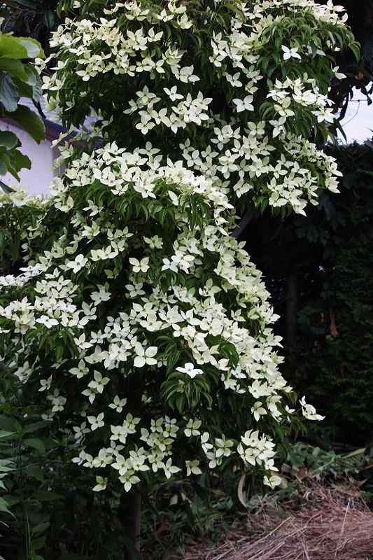 庭に植えたヤマボウシの木の花が満開になりました。園芸用なのか、山にあるものに比べて花が小さいです。