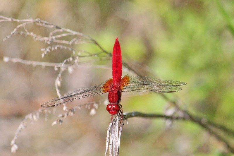化女沼に隣接する廃墟になった遊園地の池にはこの時期多数の赤いトンボが飛んでいます。赤いトンボですが赤トンボではありません。妖怪・猩猩の赤ら顔にたとえられる赤い色のトンボです。私には唐辛子みたいに見えます。池にいるのはほとんどオスでメスは池とは離れたところにいます。沼に近づくとオスたちの大歓迎?をうけます。オスメス