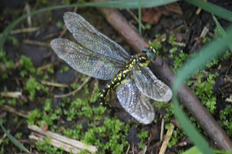 化女沼の湿った土の上でうごめいていたトンボです。すぐ逃げられたので、よく撮影できませんでした。名前がわかりませんでした。私の知っているものではヤブヤンマかと思いましたが、httさんの指摘で黄色い斑点が更紗模様のサラサヤンマと思われます。
