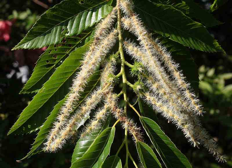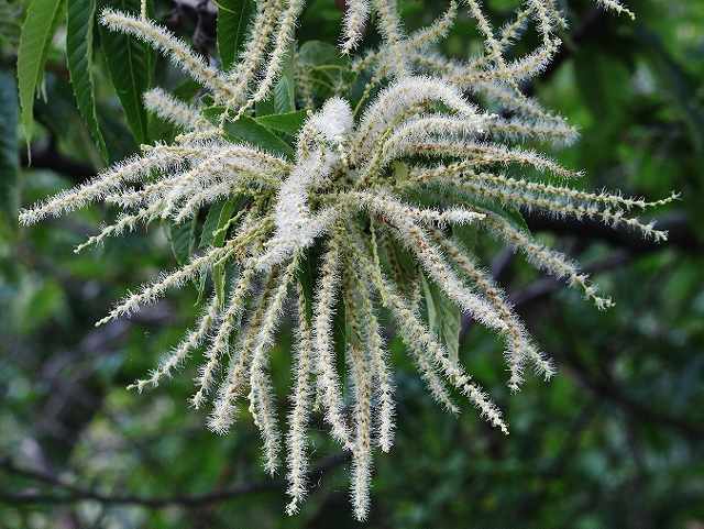 化女沼近くの自然の木々は栗の木が多いです。栗の花の白い穂は雄花です。雌花は小さくて目立たないです。栗の花からとる栗の花蜜は健康にもよく一部の人には人気があるとか。