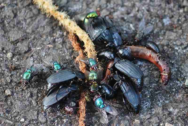 化女沼で見かけた虫です。ミミズに群がっていました。動物の死体を食べる「死出虫」。また死体を土に埋め込む習性をもつものもあり「埋葬虫」体が青緑色の金属光沢のハエはキンバエでしょうか。