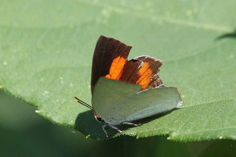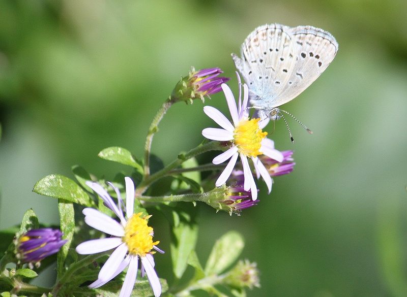 キクイモの花が咲く我が家の庭にウラギンシジミのオスがいました。やはりオスの羽の橙色は遠くでも目立ちます。ウラギンシジミ ♂イチモンジセセリキタテハノコンギク