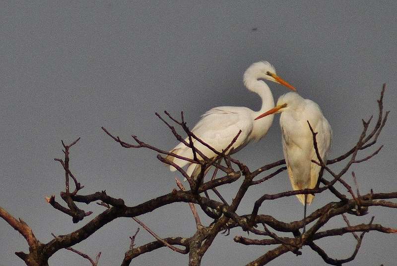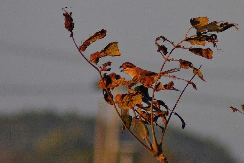 江合川の川辺の木の枝でモズが夕陽に向かって盛んに鳴いていました。川にいるのはサギとカルガモだけです。