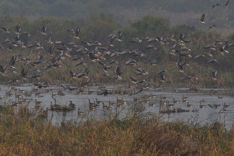 今日は蕪栗沼は朝方は靄に包まれ、ガンの声しか聞こえません。観察者も私たち2人だけでした。ここのガンも三々五々の飛びたちでした。 YOUTUBE 蕪栗沼の朝