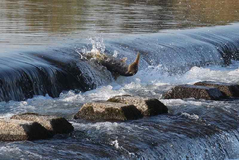 江合川でサケの遡上が始まりました。階段状の魚道で、登り切る一瞬をねらいました。北海道の鮮魚店で、腹に筋子と白子の両方を持つ珍しい秋サケが見つかったそうです。1つの体に男と女の機能を持ち合わせた個体が出現することがあるんですね。階段状の魚道セグロセキレイ