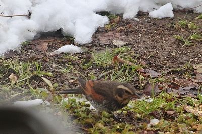 昨日からの雪で今年初めての積雪です。雪かきをして、庭のいつもの場所に鶏のエサを撒きました。今日来た戸外の(子飼い)小鳥はツグミ1羽、キジバト1羽、スズメが3羽でした。