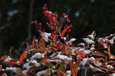 前に軽い初雪は降ったのですが、今日は本格的な初雪が降り庭は真っ白く積もりました。今はもう溶けて青空です。ナンテンにビワの花に