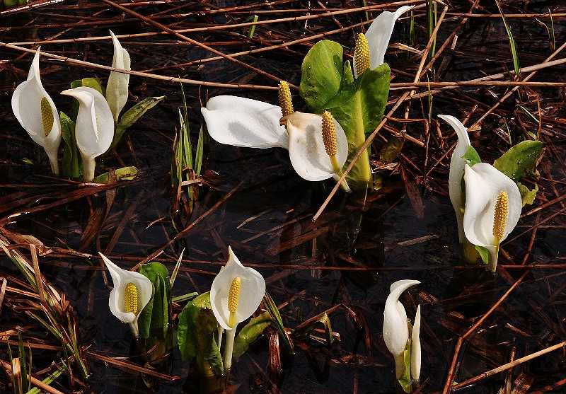 荒沢湿原の水芭蕉は見ごろは連休前ですが,連休に見に来る人が多いです。現在の湿原の水芭蕉です。葉っぱがだいぶ茂ってきました。今は小鳥の観察の好期ですが、人が多いと小鳥も姿を消してしまいます。