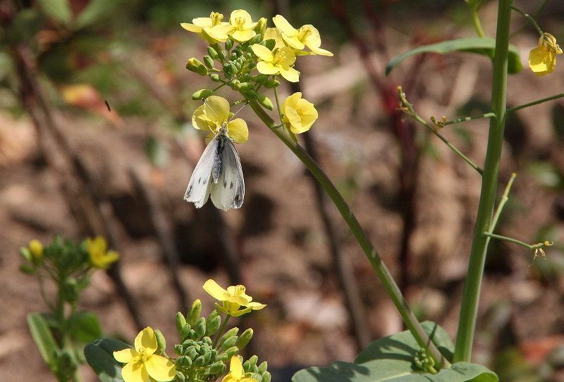 庭の片隅でじっとしていたツマキチョウが、姿を消したと思ったら我が家の菜の花畑を飛び回っていました。飛んでいるときはモンシロチョウと同じですが、少し小ぶりです。とまるとツマキチョウだとわかります。褄(ツマ)とは着物の裾(すそ)の左右両端の部分のことです。 ツマキチョウ(褄黄蝶)