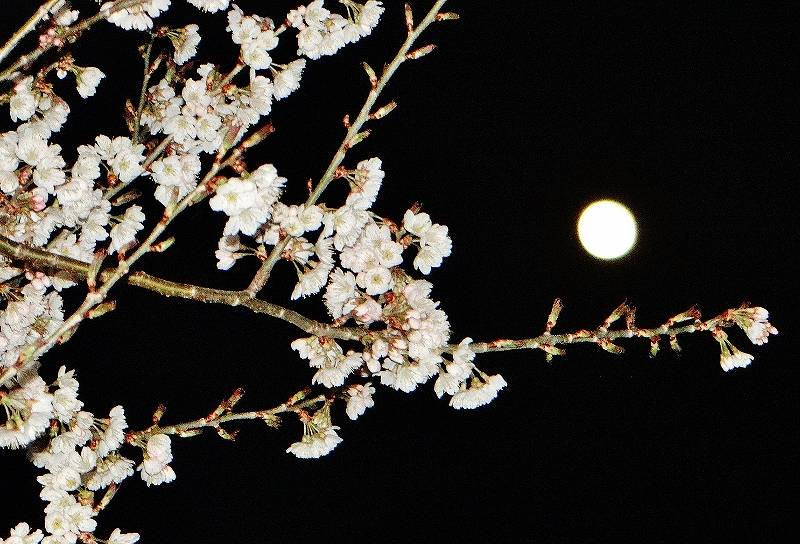 今日は満月。庭の桜もだいぶ花を開きました。今夜はブルームーン 満月と夜桜の饗宴