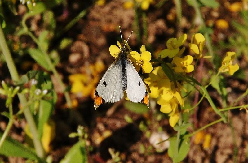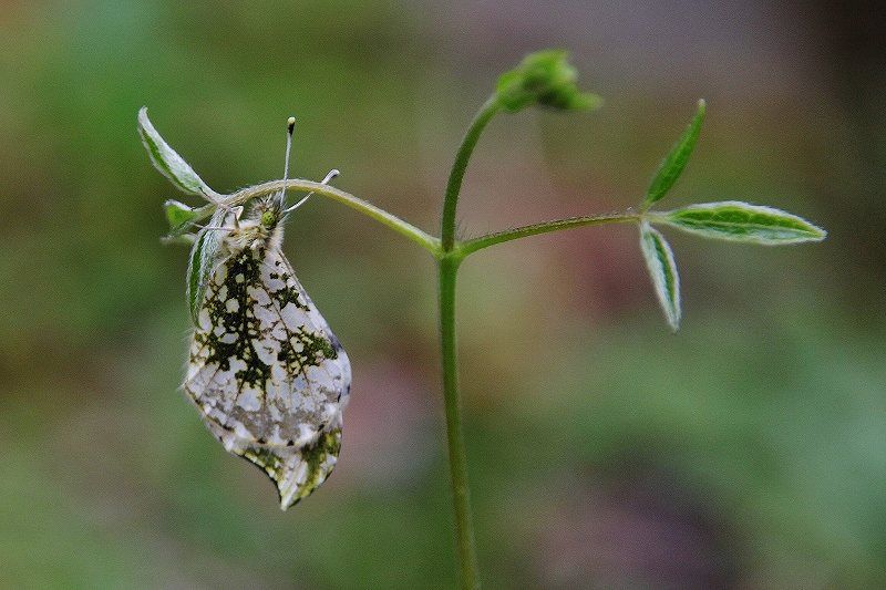 久し振りに我が家の庭でツマキチョウを見かけました。記録を見たら9年ぶりです。 → 表の翅を見るとツマキチョウだとわかります。たぶんいたのに気づかなかったのでしょう。 ツマキチョウ (褄黄蝶)の生態 春先のサクラが開花する時期にだけ現れる華奢で可憐な蝶です。 あまり目立たないだけで、少ないわけではないそうです。 飛んでいる時はモンシロチョウと全く同じに見えます。一回り小さいです。 野生のアブラナ科(タネツケバナ、イヌガラシ、ハタザオ)を好み 蕾や花、若いサヤなどに1個ずつ卵を産み付ける。 (モンシロチョウはキャベツなどの野菜を好む) 孵化した幼虫は、葉を食べずに花や蕾、若いサヤなどを食べて育つ。 (幼虫は共食いの性質があり、植物が乏しいときは、全滅を防ぐ。) 1月ほどで三日月型の蛹(枯れ草などの上に)になり春に羽化します。 条件が悪いと数年(3年)も蛹のまま過ごすものもいるそうです。翌日の24日雨ですが、同じ場所でじっとしています。
