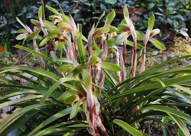 我が家の庭の花々です。シュンランニリンソウイカリソウミツバアケビ ♀ ♂ ♀ムラサキケマン白いすみれ