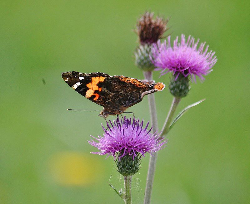化女沼の宮沢遺跡の芝生にはセンブリとノハラアザミの花がいっぱい咲いています。花にはチョウたちが集まります。アカタテハキタテハイカリモンガ