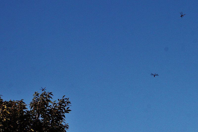 ヤマボウシが赤い実を付けた庭の秋空を赤とんぼが飛んでいました。まだ赤とんぼが飛ぶ自然がここには残っています。