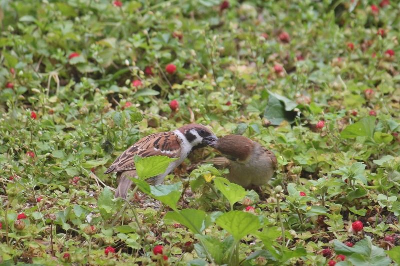 我が家の庭のスズメがヒナを連れてきました。クチバシが黄色いですね。赤い実はヘビイチゴです。