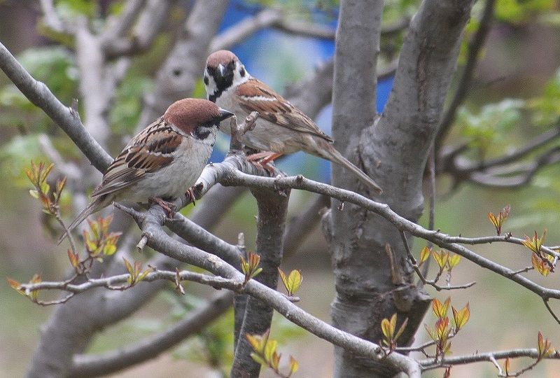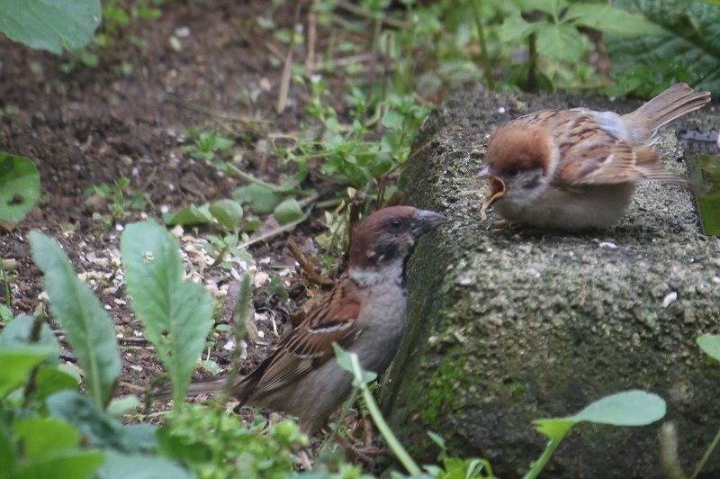我が家の庭にスズメのヒナが姿を見せるようになりました。細々とえ付けをしていた結果です。庭では恒例のディープキスが見られ、シャッターチャンスを狙っています。
