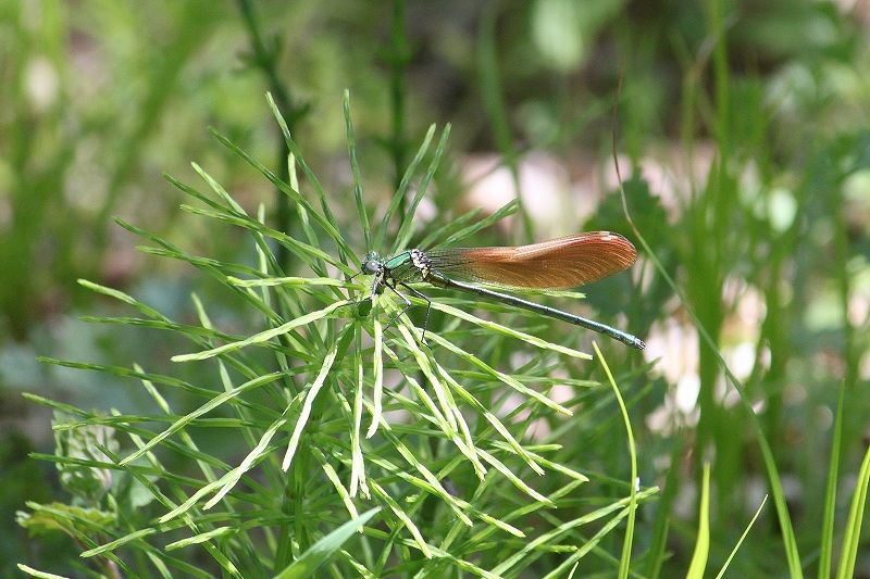 いこいの森にもカワトンボが出始めていました。 カワトンボはニホンカワトンボとアサヒナカワトンボ です。こちらにいるカワトンボは、ほぼニホンカワトンボです。 未成熟な個体はメタリックな青緑色で、成熟した個体は腹全体に白い粉を吹く オスの翅は橙色翅、淡橙色翅、無色翅の3タイプ(橙色翅型の成熟したオスは翅上部に不半透明の斑があり縁紋は赤褐色、 未成熟のものは淡橙色翅型に近い色合いで縁紋は白色だそうです)メスの翅は淡橙色翅と無色翅の2タイプがあります。