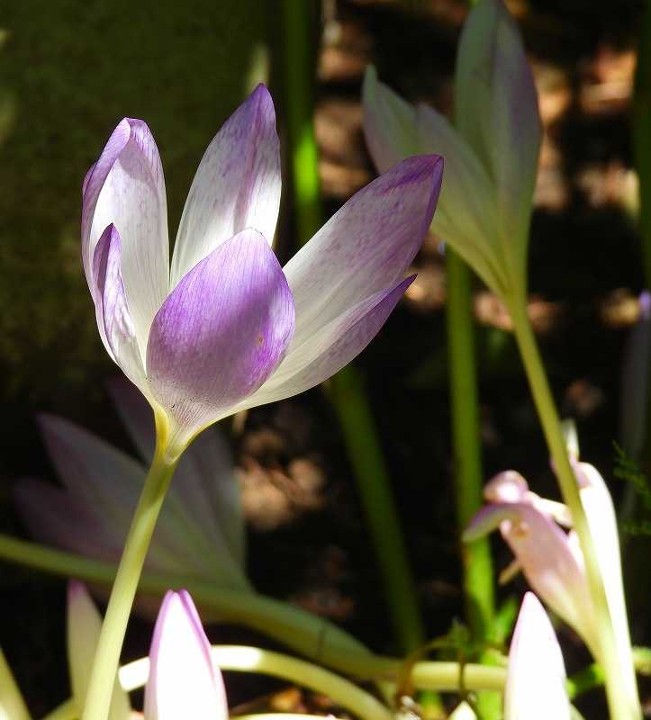 庭にイヌサフランの花が群生しています。 イヌサフラン1. 有毒性 球根にはコルヒチンが含まれ重篤な中毒を引き起こす。2. 薬用植物 痛風の治療や抗がん剤。3. 文化的な象徴 「秋桜」と並んで、秋の風景を彩る存在です。4. 花言葉 「悲しみ」や「別れ」、どこか切ない印象を与える花。