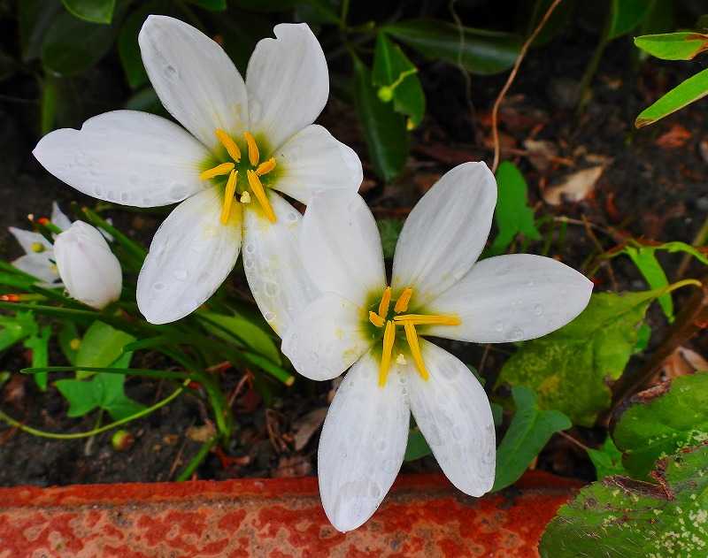 我が家の庭に咲始めた花始めた花です。タマスダレ 玉簾 別名 四季水仙 (ヒガンバナ科) 白い小さな花を玉、葉が集まっている様子を簾まだ近くには白い花の桔梗も咲いていました。