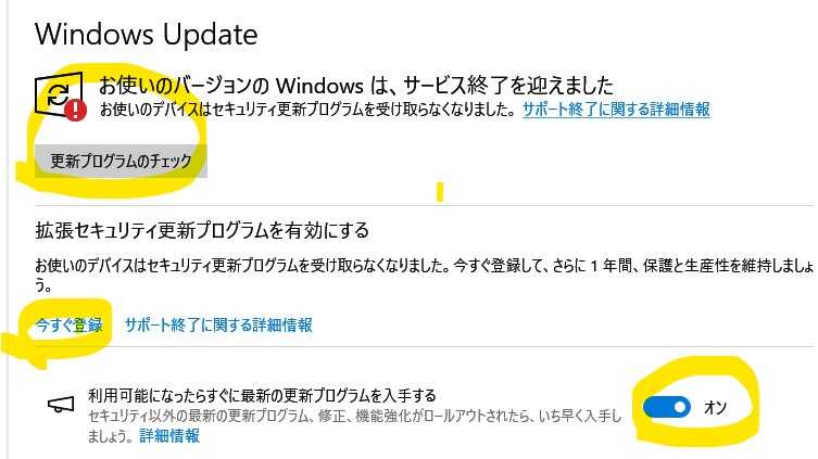 Win10のパソコンをまだ使っている方への参考になればと思いました。私は3台持っていますが皆Win10です。安心のために以下のサポート延長しました。3分でできますよ!私もWin10のサポートが終わるという事は知っていましたが、まあ使えるだけ使えばいいと簡単に考えていました。一昨日、サポートが終わるのでパソコンを買い換えなければ使えないと相談に来た方がいました。使えるだけ使ったらと軽く答えていましたがちょっと心配になり調べました。 Win10のサーポートは10月14日で終わりました。 サポートが終わっても、とりあえずそのまま使えます。 Win10は世界でも半数の方が使っていて、みなが買い替えしないと 何かトラブルが起こり世界に広がったら大変と、マイクロソフトは サポートを1年間延長することにしました。 (ちまたでは、また来年になったらまた延長するのではと。) ただそのままではサポートされないので、以下をする必要があります。 これで来年の10月13日までは安心して使えます。 私が見たのでは次のサイトが参考になりました。 Windows10サポート延長【完全解説】金子晃之 【Windows10】サポート延長のやり方簡略には以下です。 Win10パソコンの1年サポート延長の手順 1 パソコン画面左下のスタートをクリック →歯車マーク設定→更新とセキュリティ(下図) 2 更新プログラムを最新にしてください(少し時間かかります) 3 利用可能になったら最新のプログラムを入手する オン 4 今すぐ登録 → → 完了 (10秒くらいで終わります) 「!お使いのバージョンのWinはサービス終了を迎えました → 最新の状態です